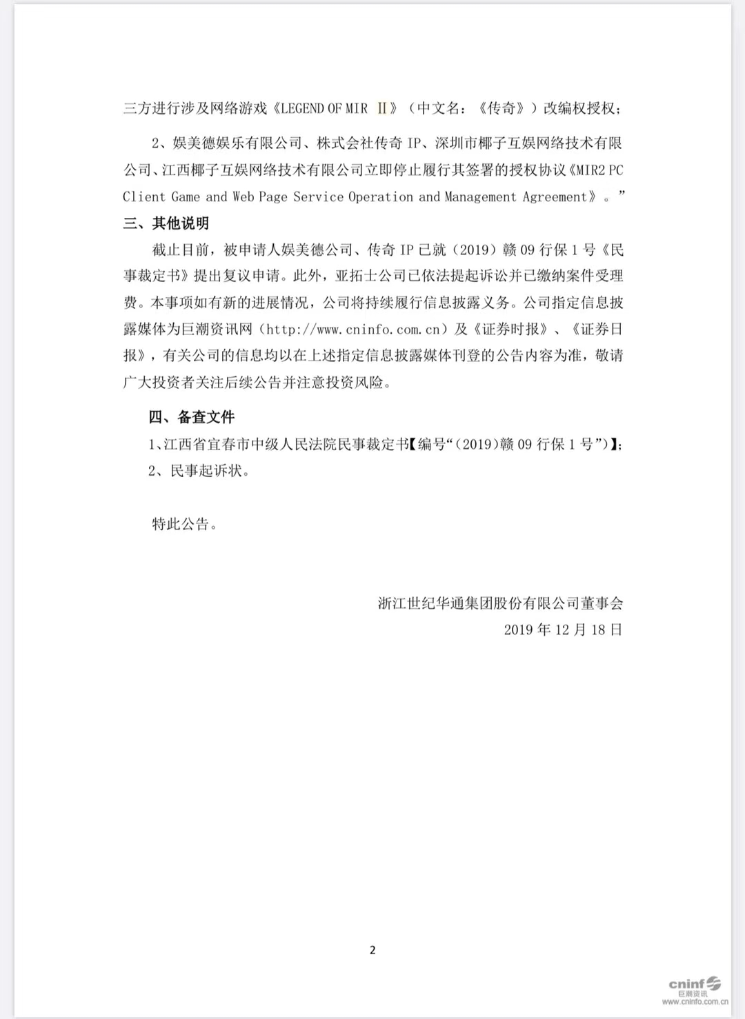 12月18日晚,世纪华通发布公告称,集团控股子公司亚拓士软件有限公司(以下简称“亚拓士公司”)于近日收到江西省宜春市中级人民法院(以下简称“宜春市中院”)寄送的(2019)赣09行保1号《民事裁定书》。裁定结果显示,娱美德娱乐有限公司(以下简称“娱美德公司”)、株式会社传奇IP(以下简称“传奇IP”)立即停止在中国大陆向任何第三方进行涉及网络游戏《LEGENDOFMIRⅡ》(中文名:《传奇》)改编权授权。