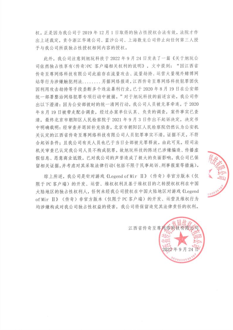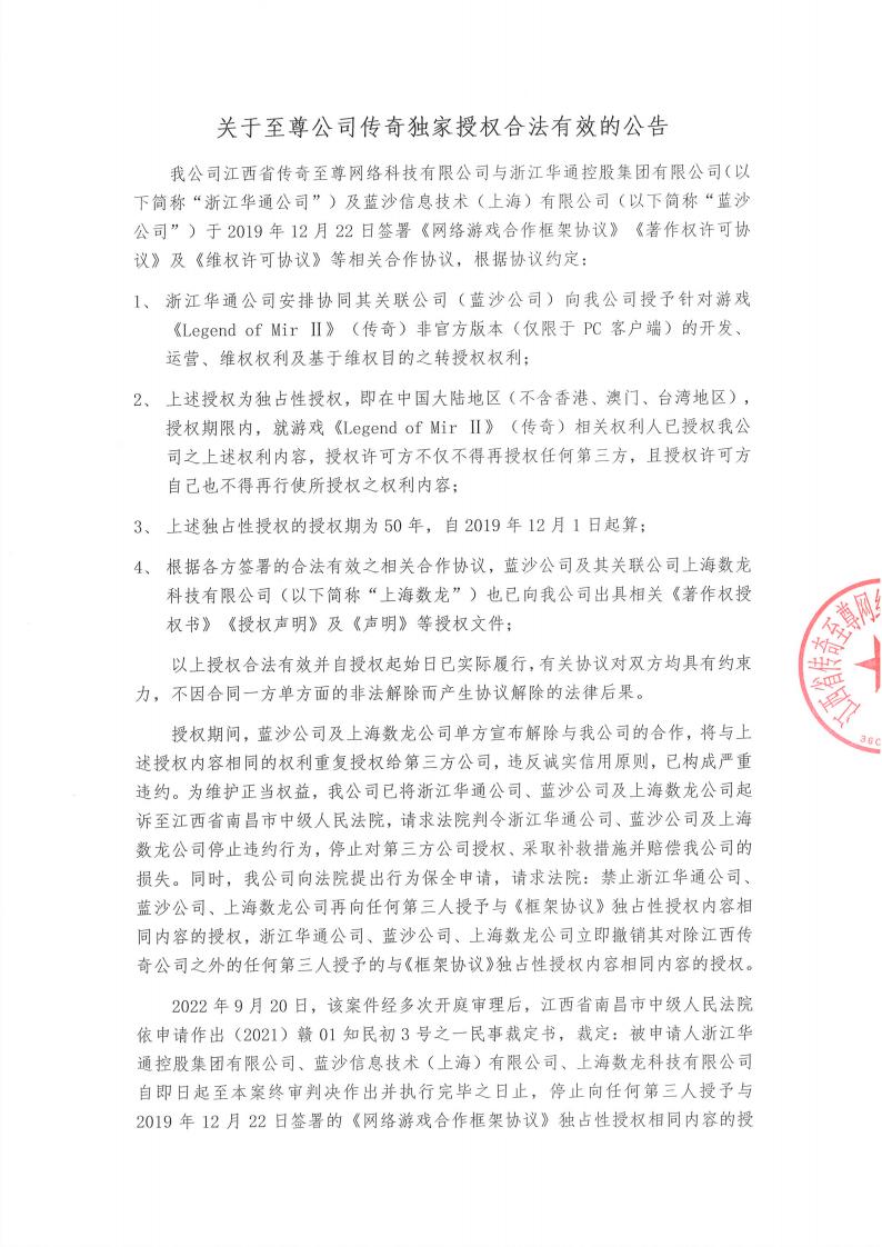 关于至尊公司传奇独家授权合法有效的公告